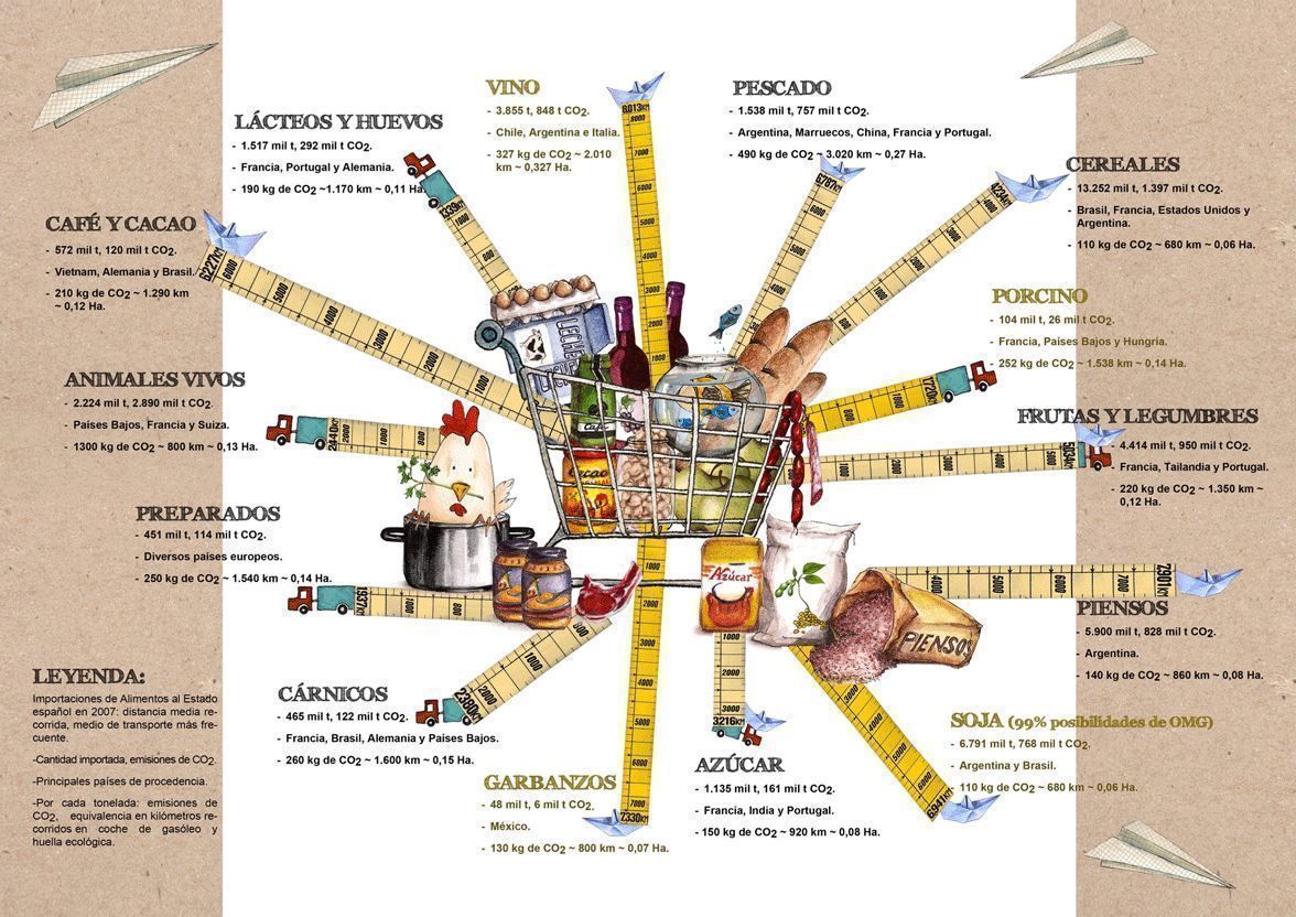 Según datos de la organización ecologista Amigos de la Tierra, más del 80% de los que consumimos proceden del mercado exterior. en 2019, España importó 43,35 millones de toneladas de alimentos en 2018, los cuales recorrieron cerca de 7.000 km y generaron más de 6.500 millones de toneladas de CO2.